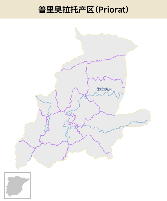 普里奧拉托產(chǎn)區(qū)位于西班牙加泰羅尼亞(Catalonia)地區(qū)、塔拉戈納(Tarragona)省的中心。該產(chǎn)區(qū)靠近西班牙東北部的地中海沿岸,北部是蒙桑特山脈(Montsant Mountain),埃布羅河(Ebro River)的支流休拉納河(Siurana River)貫穿整個(gè)產(chǎn)區(qū)。