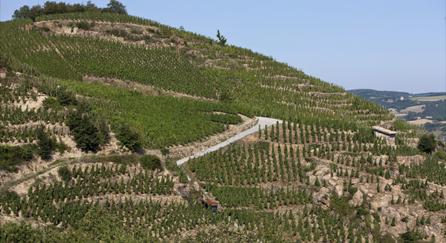 在北羅納河谷葡萄園,河流流經之處多為狹窄的峽谷和陡峭的山坡,因此葡萄園也更多地種植在靠近河流的陡坡上。由于離海洋較遠,北羅納河谷葡萄園以大陸性氣候為主,但又多多少少會受到地中海(Mediterranean)氣候的影響,夏季炎熱干燥,冬季寒冷少雨。這里的土壤以礫石、頁巖和石灰巖為主,排水性能優越。這樣一來,種植在山坡上的葡萄藤可以更好地接收生長季充足的陽光,再加上排水性良好的土壤,有助于葡萄果實更好地成熟。北羅納河谷葡萄園著名的子產區羅第丘(Cote Rotie)的產區名在法語中意為“被炙烤的山坡”,就很形象地描繪了這一風土特點。