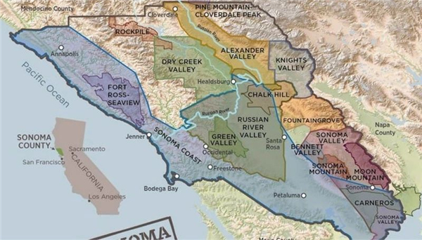 知名的納帕谷AVA旁邊,其實有一個較鮮為人知但圈內人很推崇的大產(chǎn)區(qū),叫索諾馬 (Sonoma) AVA,其緯度、氣候與納帕谷相當,區(qū)域面積更廣,也更靠近海洋,整體而言更能凸顯風土變化,因此更能夠找到適合每一品種的區(qū)域進行種植。