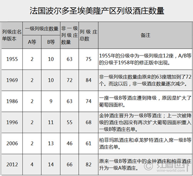 右岸的圣埃美隆葡萄酒商會在上世紀50年代決定起草一份列級酒莊分級制度,分為兩大等級,一個是分為A、B兩等的一級列級酒莊(Premier Grand Cru Classe),另一個是列級酒莊(Grand Cru Classe)。與1855年波爾多分級體系不一樣的是,圣埃美隆酒莊的評級結(jié)果并不是一成不變的。