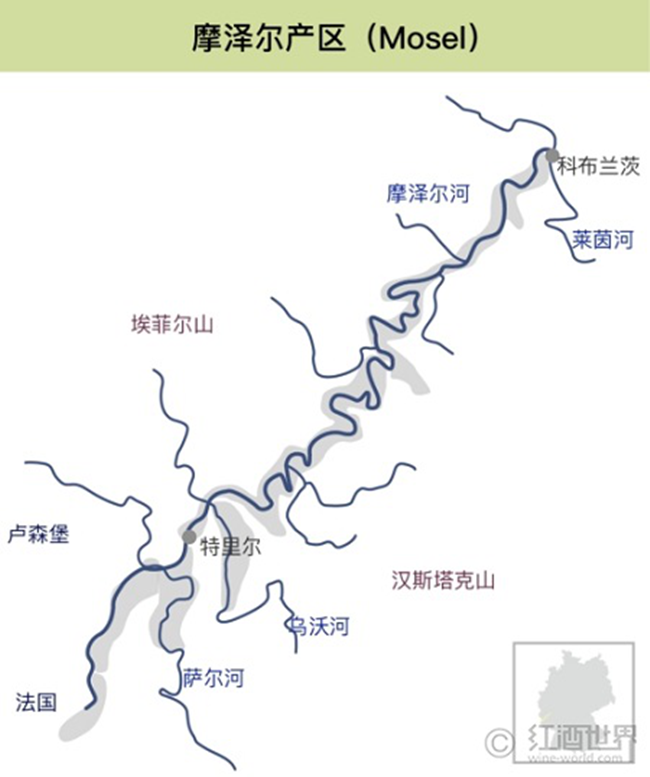 摩澤爾產區是德國13個法定葡萄酒產區之一,其產量在德國排名第三,不過,由于摩澤爾享譽國際的名聲,常常有人將其視為產區中的領頭者。摩澤爾產區包括摩澤爾河(Mosel River)及其支流薩爾河(Saar River)和烏沃河(Ruwer River)的河谷地區,其名字也來源于摩澤爾河。實際上,在2007年8月1日之前,該產區名字為摩澤爾-薩爾-烏沃(Mosel-Saar-Ruwer),后來為了便于記憶而簡化為了摩澤爾。
