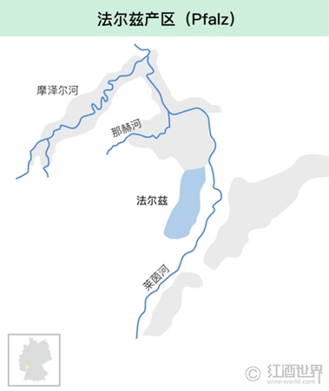 法爾茲產區北接萊茵黑森(Rheinhessen),南部、西部則與法國接壤,其葡萄園南北綿延達80公里。從面積上來說,法爾茲是德國第二大產區,但其產量時常能夠占據13產區之首。產區名字“Pfalz”來源于拉丁語“palatium”,意為“宮殿”。