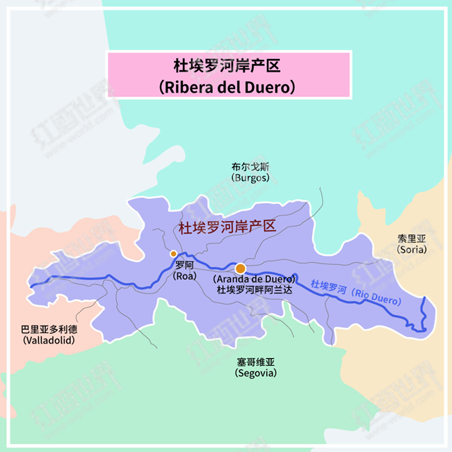 杜埃羅河岸位于伊比利亞半島(Iberian Peninsula)北部的高地,是卡斯蒂利亞-萊昂自治區(Castilla y Leon)的著名子產區。該產區沿杜埃羅河(Rio Duero)及其支流分布,在行政區劃上涉及索里亞(Soria)、布爾戈斯(Burgos)、巴利亞多利德(Valladolid)和塞哥維亞(Segovia)這四個省。產區葡萄園占地約22,500公頃,多分布于海拔760至945米的高地,且集中在河岸朝北或朝南的山坡上。