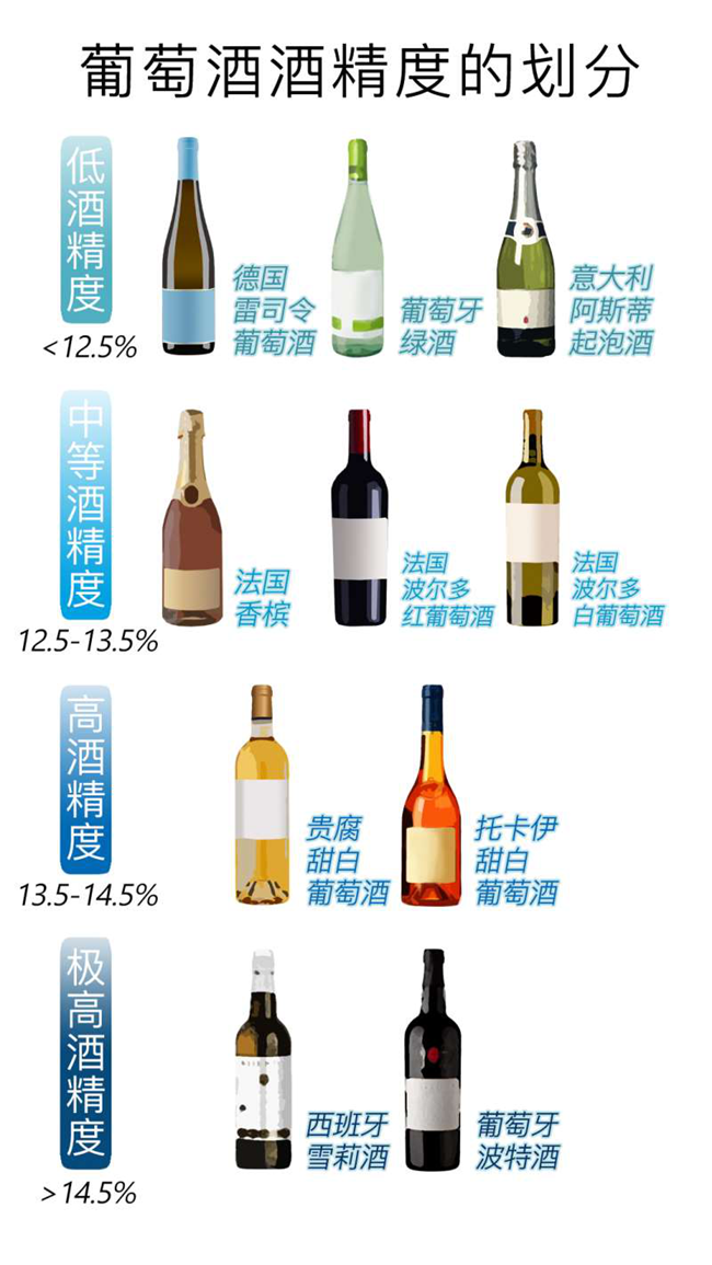 德國雷司令(Riesling)葡萄酒、葡萄牙綠酒(Vinho Verde)和意大利阿斯蒂(Asti)起泡酒等因為釀造品種酸度高,糖分少,屬于天然低酒精度的葡萄酒,酒精含量通常低于12.5%;法國香檳(Champagne)、法國波爾多(Bordeaux)白葡萄酒和紅葡萄酒等則屬于中等酒精度的行列,這類葡萄酒的酒精含量通常在12.5%-13.5%之間;貴腐(Noble Rot)甜白葡萄酒因為釀酒葡萄糖分濃縮度高,屬于高酒精度葡萄酒的范疇,酒精含量一般在13.5%-14.5%之間;西班牙雪莉酒(Sherry)和葡萄牙波特酒(Port)等類型的加強型葡萄酒(Fortified Wine)則是酒精度非常高的葡萄酒,該類酒在釀造時通過添加酒精殺死酵母以達到對酒液進行加強的效果,酒精含量往往在14.5%以上。