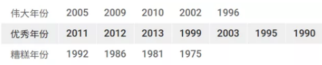 勃艮第雖然擁有許多超級名莊(如羅曼尼·康帝、亨利·賈伊等),但是在上世紀(jì)7、80年代,勃艮第的好年份乏善可陳。進(jìn)入21世紀(jì)之后,勃艮第的年份普遍評價(jià)較高,除了天氣條件較好之外,釀酒師的努力有目共睹。
