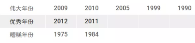 建議:如果想要一瓶馬上可以喝的品質(zhì)優(yōu)異的勃艮第的話,2009年份是很好的選擇。這一年的勃艮第普遍酸度較低,單寧成熟度較高,適合較早飲用。2010年份的夜丘也不錯(cuò),不過該年份產(chǎn)量較低,不太容易買到合理價(jià)位的酒。2011年份則表現(xiàn)不均勻。對于收藏家來說,2005年份仍然是首選,前提是你現(xiàn)在還能買得到!