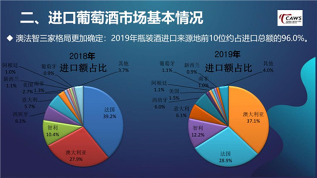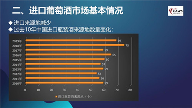 此外,進口來源地減少,2019年瓶裝酒進口來源地前十位約占進口總額的96.0%。其中,又以澳大利亞葡萄酒的表現(xiàn)最為突出,在2019年以8個點的差距反超了法國葡萄酒,但在接下來的市場競爭中,澳大利亞葡萄酒也面臨一定挑戰(zhàn):首先,零關稅、大品牌驅動、投資移民等因素的推動作用會在階段性變化中逐漸減弱,澳洲與法國在接下來的市場中差距不會進一步拉大;其次,意大利、智利等國葡萄酒在中國市場競爭愈加激烈化,近兩三年來,他們明顯加強了在中國市場的投入,處在一個比較穩(wěn)定的上升階段,我個人比較看好他們接下來的表現(xiàn)。