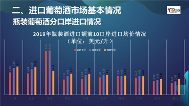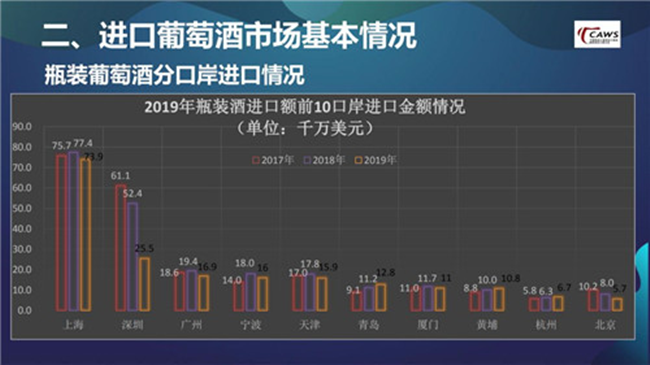 在仔細分析口岸數(shù)據(jù)后就會發(fā)現(xiàn),深圳由2018年的5.24億美元,迅速下滑到2019年的2.55億美元。我認為這與2018年,深圳口岸由于種種原因進口了大量的高端酒、奢侈酒有關。進一步去想,2019年整個大盤下跌15%,受高端酒、奢侈酒的影響較大,整個市場其實并沒有受到過多沖擊。
