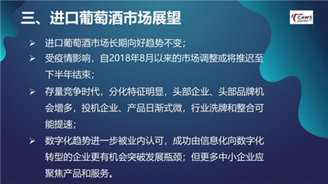在今年,雖然疫情延長了市場調(diào)整期,但國內(nèi)經(jīng)濟韌性十足、防控工作及時到位,在年底或明年初,葡萄酒市場會逐步邁入佳境。對于進口葡萄酒而言,向好的趨勢不會改變。值得一提的是,隨著國家經(jīng)濟增速的減緩,進口葡萄酒市場轉變?yōu)榇媪渴袌龅那闆r越發(fā)明顯,一個顯著熱點就是分化,頭部企業(yè)的機會增多,投機企業(yè)、產(chǎn)品日漸式微,行業(yè)洗牌和整合可能提速。