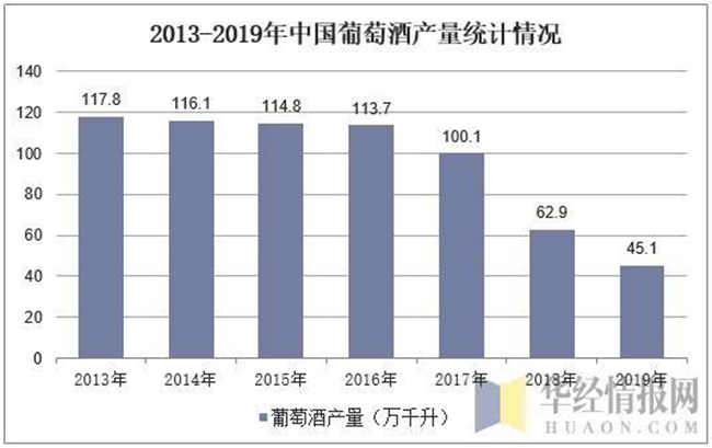然而,目前中國的葡萄酒產業發展并不成熟,隨著我國國民生活質量的提高,對高端葡萄酒需求增加,進口葡萄酒快速蠶食國產葡萄酒市場份額,近年來中國葡萄酒產量持續下降,2019年中國葡萄酒產量達45.1萬千升,與2018年相比減少了17.8萬千升。
