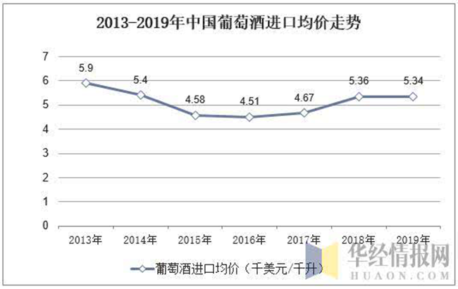從進口均價來看,近年來我國葡萄酒進口均價基本維持在5千美元/千升,2015年葡萄酒進口均價下降至5千美元/千升以下,2016年以后葡萄酒進口價格又逐漸開始回升,據海關統計數據顯示,2019年國內葡萄酒進口均價為5.34千美元/千升,與2018年基本持平。