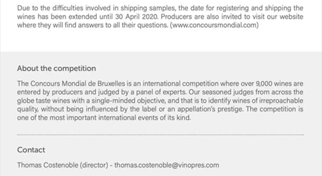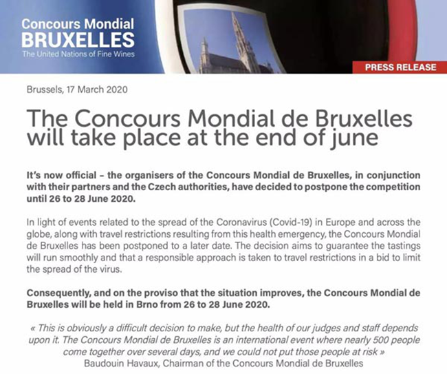 針對目前流行的Covid-19新型冠狀病毒對于全球的影響,在經過組委會與主辦地的積極協商后,現決定“2020(捷克·布爾諾)比利時布魯塞爾國際葡萄酒大獎賽”將延期至2020年6月26日至28日舉辦。同時,為了緩解報名企業的物流運輸壓力,全球樣品征集截止時間也將適度順延。