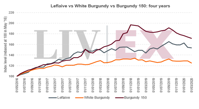 然而,在過去的一年,勒弗萊(6.5%)的表現也優于勃艮第150(-7.2%)。 事實上,勃艮第150指數是表現最差的Liv-ex 1000分項指數; 我們在最近的專題報告: 高峰后的勃艮第 中也探討了它的跌勢。