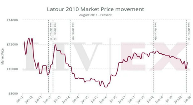 有跌有升,在接下來的幾年,此酒的價(jià)格開始隨大市走強(qiáng)而上升。然而,在2018年再次被確認(rèn)98+分后,價(jià)格又再次波動(dòng)。如今,此酒比其2011年時(shí)的前倫敦發(fā)行價(jià)(11,000英鎊 每箱12×75)折價(jià)5%。