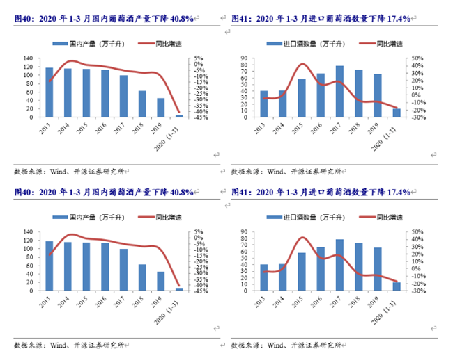 觀察行業(yè)數(shù)據(jù),2020年1-3月國(guó)內(nèi)葡萄酒產(chǎn)量同比降40.8%,降幅較年初擴(kuò)大;進(jìn)口酒量同比下滑17.4%,同樣加速下滑。