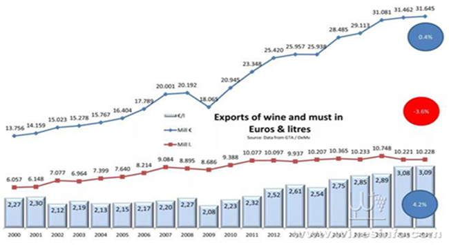 散酒貿(mào)易總量趨于平緩,而總價(jià)方面的上升也開(kāi)始出現(xiàn)了疲軟的這個(gè)勢(shì)頭。大家越來(lái)越希望拿到高質(zhì)量的葡萄酒。作為散酒出口大國(guó),散酒貿(mào)易收縮的局面對(duì)于西班牙的出口是個(gè)威脅。