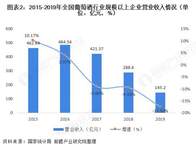 在營業收入與利潤總額方面,全國葡萄酒行業規模以上企業已經連續三年“雙降”。2019年全國葡萄酒行業規模以上企業實現營業收入145.2億元,同比下滑17.5%;實現利潤總額10.6億元,同比下滑16.7%。