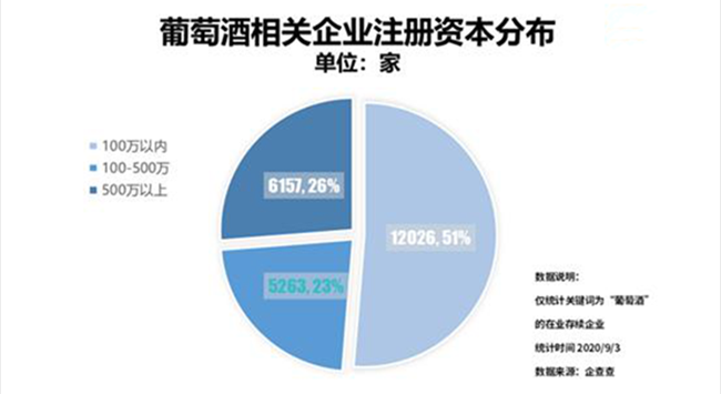 由于疫情發(fā)生在酒類銷售旺季的春節(jié)期間,使得葡萄酒生產(chǎn)商受到較大影響,13家上市葡萄酒企均呈現(xiàn)虧損狀態(tài)。企查查數(shù)據(jù)顯示,目前我國共有2.3萬家葡萄酒相關(guān)企業(yè),其中山東以3266家排名第一,廣東、福建緊隨其后。2019年,相關(guān)企業(yè)新增3212家,同比增長7%,今年以來新增量為1784家,同比下降14%。此外,全行業(yè)51%的企業(yè)注冊資本低于100萬。