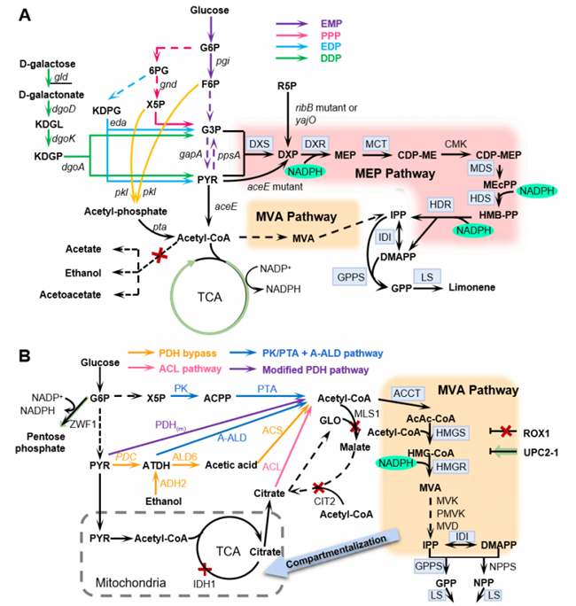 楊曉兵副教授團(tuán)隊長期致力于利用代謝工程和合成生物學(xué)策略構(gòu)建高價值化合物細(xì)胞工廠的研究工作。目前,已利用代謝工程策略成功改造圓紅冬孢酵母(Rhodosporidium toruloides)構(gòu)建了檸檬烯等單帖化合物、羥基化脂肪酸、氨基酸衍生物的細(xì)胞工廠,其中檸檬烯微生物合成相關(guān)研究工作獲得陜西省面上基金(2020JM177)、學(xué)校科研啟動基金、國家級科創(chuàng)等支持,指導(dǎo)2016本科生任毓瑤畢業(yè)論文獲得校級畢業(yè)論文。該綜述介紹了微生物合成檸檬烯及其衍生物面臨的機(jī)遇與挑戰(zhàn),詳細(xì)闡述了異戊二烯途徑多樣性、代謝路徑關(guān)鍵酶的發(fā)掘與表征、宿主細(xì)胞代謝路徑的理性調(diào)控、輔因子平衡、檸檬烯及其衍生物生物毒性的解除及提升宿主微生物魯棒性的策略等內(nèi)容。本綜述詳盡討論了大腸桿菌、釀酒酵母、藍(lán)細(xì)菌和產(chǎn)油酵母等生產(chǎn)平臺菌株的優(yōu)勢與不足,為系統(tǒng)地理性改造微生物代謝網(wǎng)絡(luò)構(gòu)建單帖細(xì)胞工廠提供了科學(xué)參考。