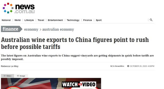 澳新網報道,根據澳洲葡萄酒機構(WA),2019年9月至2020年9月,澳洲出口至中國(包括中國香港、澳門地區)的葡萄酒價值達到了創造紀錄的125億元。