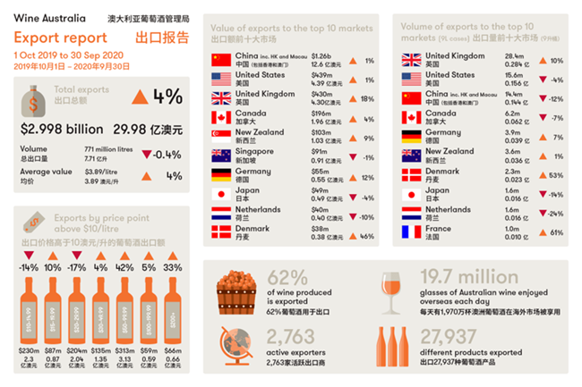 根據(jù)澳大利亞葡萄酒管理局在10月28日發(fā)布的最新出口報告顯示,澳大利亞葡萄酒的全球需求保持穩(wěn)定,五大目的地市場的出口總額增長了4%至29.98億澳元。