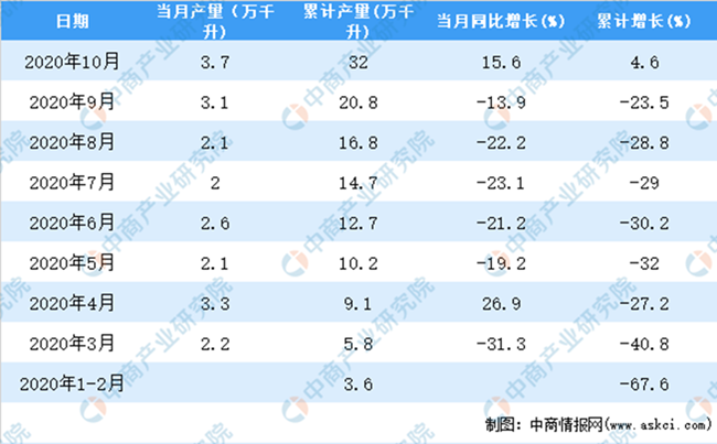 2020年1-10月全國葡萄酒產量統計