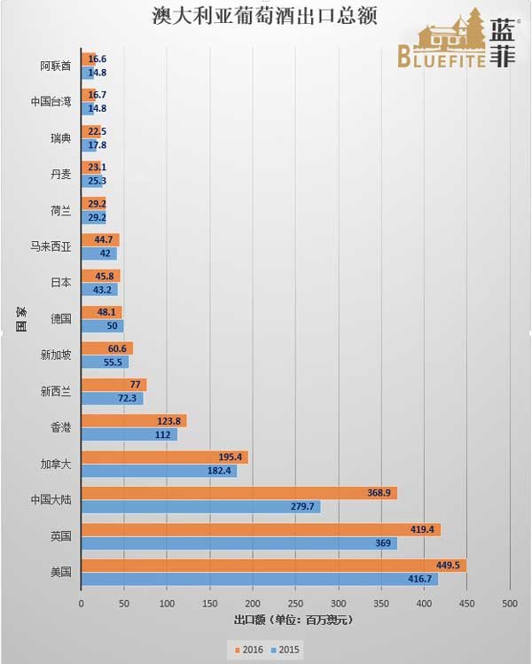 2016年的《澳大利亞葡萄酒出口報告》顯示,2015年6月至2016年6月,澳大利亞的葡萄酒出口額達(dá)到21.1億美元(約人民幣140億9290萬元),同比增長11%;出口量則達(dá)到7億2,800萬升,同比增長0.5%。