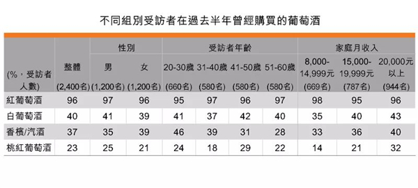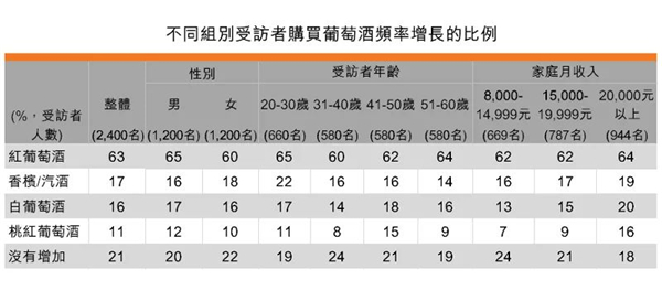 同時(shí),家庭月收入越高,受訪者購(gòu)買不同類別葡萄酒的比例也越高。例如家庭月收入在20,000元以上的受訪者曾購(gòu)買白葡萄酒、香檳及起泡酒、桃紅葡萄酒的比例,明顯高于家庭月收入在8,000-14,999元的受訪者。