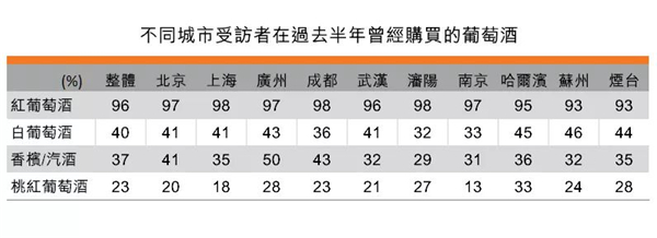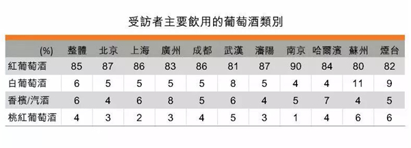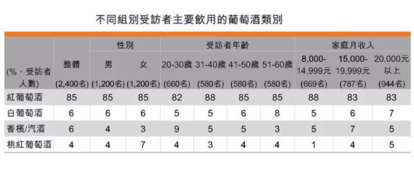 這次調(diào)查把葡萄酒分為四大類別:紅葡萄酒、白葡萄酒、桃紅葡萄酒及香檳及起泡酒。數(shù)據(jù)顯示: