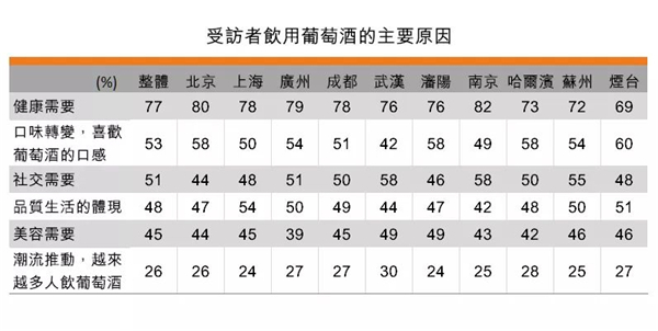 根據(jù)調(diào)查顯示結(jié)果,近年來內(nèi)地消費(fèi)者對(duì)飲用葡萄酒的態(tài)度觀念有所改變。以往飲用葡萄酒主要是商務(wù)應(yīng)酬或社交需要,現(xiàn)在則有77%表的受訪者表示飲用葡萄酒的原因是健康需要;53%表示口味轉(zhuǎn)變,喜歡葡萄酒的口感。只有51%受訪者表示飲用葡萄酒是因?yàn)樯缃恍枰?而受潮流影響的則只有26%。