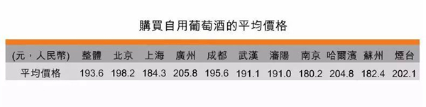 對(duì)于購(gòu)買自用的葡萄酒,受訪者趨向理性消費(fèi)。47%受訪者購(gòu)買葡萄酒的價(jià)格范圍在101-200元之間;整體受訪者平均購(gòu)買自用的葡萄酒價(jià)格約193.6元一瓶。其中,廣州為205.8元、哈爾濱為204.8元,煙臺(tái)為202.1元,受訪者平均購(gòu)買自用葡萄酒的價(jià)格較高,超過200元一瓶。