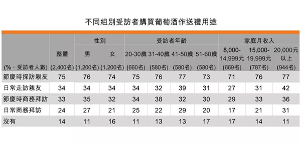 若以受訪者年齡區(qū)分,年輕受訪者以葡萄酒作為送禮用途的比例較年長(zhǎng)受訪者高。例如20-30歲受訪者中有89%表示曾購(gòu)買葡萄酒作為禮物,而51-60歲受訪者中則有83%。另外,家庭月收入越高,購(gòu)買葡萄酒作為禮物的比例也越高。家庭月收入20,000元以上的受訪者中有89%表示有購(gòu)買葡萄酒作為禮物,而家庭月收入在8,000-14,999元的則有83%。