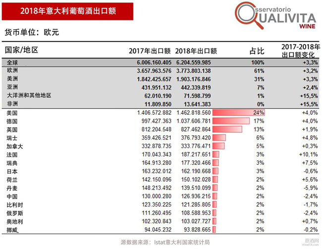 與2017年相比,意大利葡萄酒對其主要海外市場的出口額均實(shí)現(xiàn)了增長,按上升幅度來看依次是:意大利葡萄酒對法國出口額同比2017年增加10.1%,對瑞典出口額增加7.5%,對瑞士出口額增加4.8%,對美國和德國出口額均增加4%,對英國出口額增加1.9%。