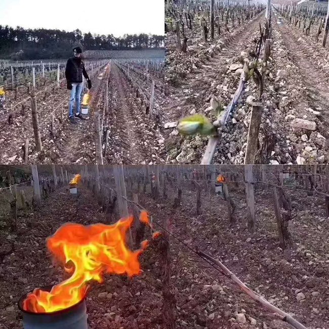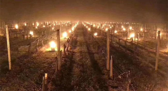 為避免已經開始發(fā)芽的葡萄遭受低溫侵害,數(shù)以百計的人們在葡萄園內用草生火,并使用燃燒的火盆來抵抗霜凍。