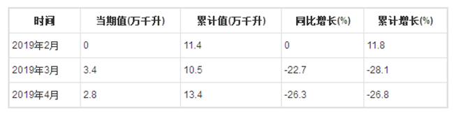 2019年4月全國葡萄酒產量為2.8萬千升,累計值為13.4萬千升,同比下降26.3%,累計下降26.8%。