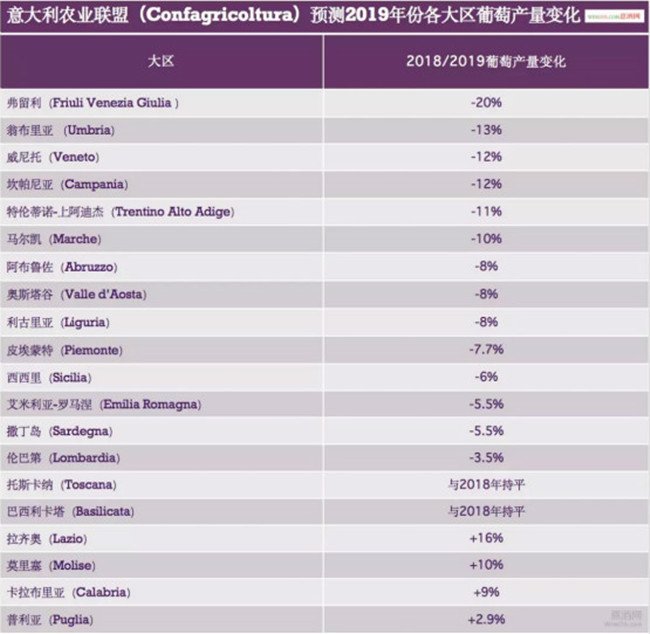 意大利農(nóng)業(yè)聯(lián)盟(Confagricoltura)研究中心也主要針對(duì)2019年意大利各大區(qū)的葡萄產(chǎn)量進(jìn)行了預(yù)測。在分析了來自個(gè)大區(qū)主要葡萄酒產(chǎn)區(qū)的代表性酒莊的葡萄樣本之后,意大利農(nóng)業(yè)聯(lián)盟(Confagricoltura)研究中心認(rèn)為,2019年,意大利大部分地區(qū)的葡萄產(chǎn)量都將出現(xiàn)不同程度的下降。其中弗留利(Friuli Venezia Giulia )大區(qū)的葡萄產(chǎn)量降幅最大,預(yù)計(jì)將比2018年減少20%。翁布里亞、威尼托、坎帕尼亞、特倫蒂諾-上阿迪杰、皮埃蒙特、艾米莉亞-羅馬涅等大區(qū)在2019年的葡萄產(chǎn)量都將出現(xiàn)不同程度的降幅。