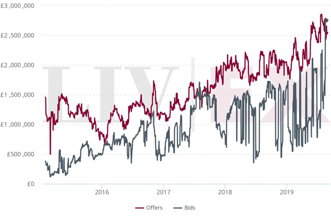 如上圖所示,早于2015年,意大利的出價和報價總值已接近200萬英鎊。 現在,這數字更已超過500萬英鎊,很大程度上是由活躍買家所推動; 由此可反映市場對意大利葡萄酒的興趣日增。