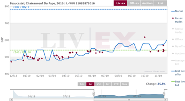 排名第六的博卡斯特爾,Chateauneuf du Pape 2016年,本周初也出現多次交易,最后成交價為536英鎊 (每箱12×75);較發行價(480英鎊)漲了12%。11月以來,此酒也是在第二最高交易總值和數量的羅納葡萄酒。