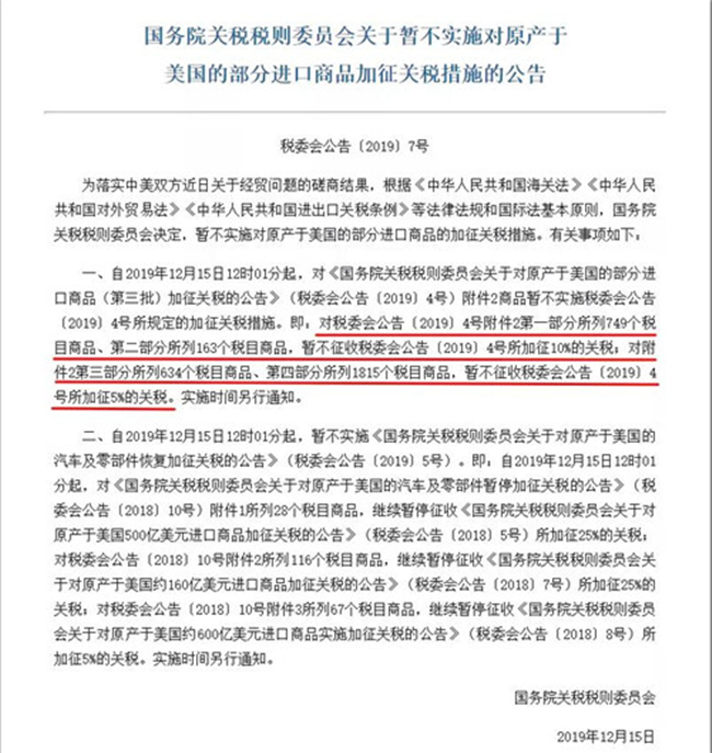 作為回應,中國將購買更多的美國農產品,增加美國公司進入中國市場的機會。因此,中國國務院關稅稅改委員會發布公告,將暫停實施原計劃于 2019 年 12 月 15 日 12 時 01 分起實施的《國務院關稅稅則委員會關于對原產于美國的部分進口商品(第 3 批)加征關稅的公告》加征關稅措施。具體政策如下: