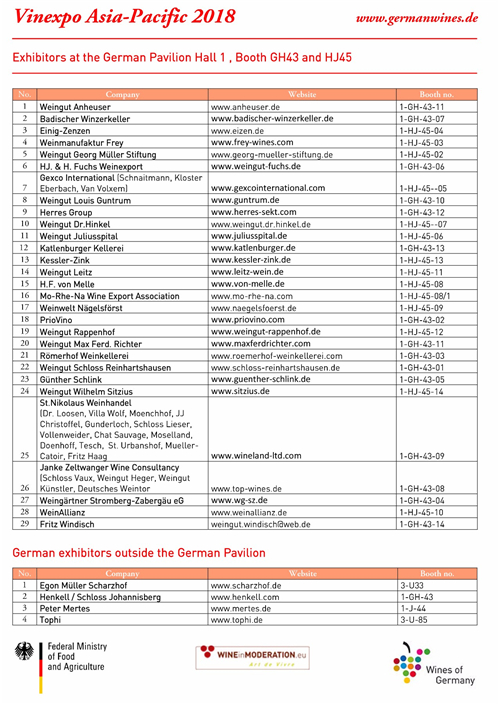 2018 年 5 月 29-31 日,Vinexpo 香港展將在香港會議展覽中心迎接其第20周年的到來。在此之際,德國聯邦食品和農業部將再次組織德國展團集體參加 Vinexpo香港展,多達 29 家德國葡萄酒生產商或酒莊代表將會出席此次盛會。