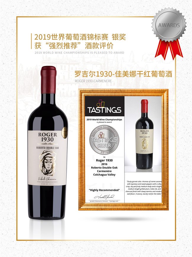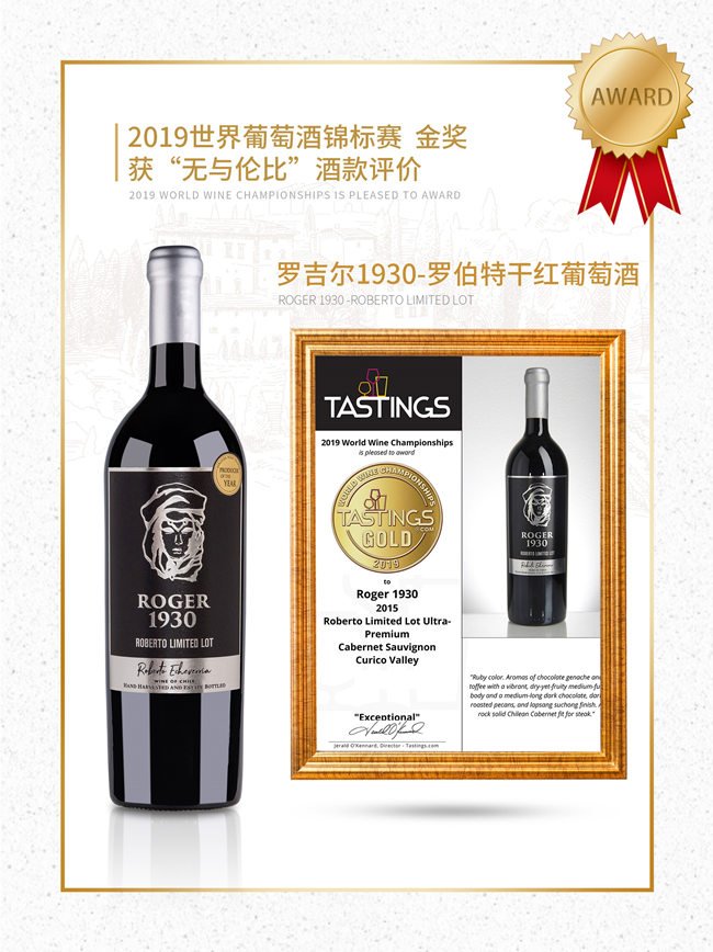 羅吉爾1930-羅伯特紅葡萄酒呈深邃的寶石紅色;酒香非常柔和,伴有精致的黑加侖,黑李子的果香以及甘草、煙熏的香氣;口感優(yōu)雅豐富,層次鮮明且多變,單寧強(qiáng)勁,令人十分愉悅。在榮獲2020柏林葡萄酒大獎賽金獎的榮譽(yù)之前,就已經(jīng)獲得了2019世界葡萄酒錦標(biāo)賽金獎的榮譽(yù),以及“無與倫比”酒款評價!