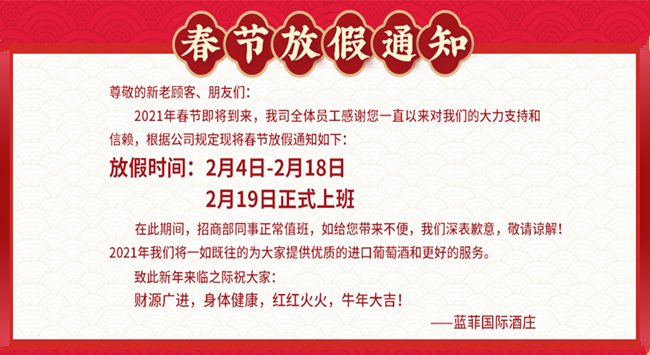 • 白駒過隙,又是一年春節(jié)到!惜別2020年,迎來了充滿希望、機(jī)遇和挑戰(zhàn)的2021年!正值中國的傳統(tǒng)節(jié)日“春節(jié)”來臨,在此藍(lán)菲酒業(yè)全體員工向大家拜個(gè)早年!恭祝大家新春快樂,財(cái)源廣進(jìn)!...